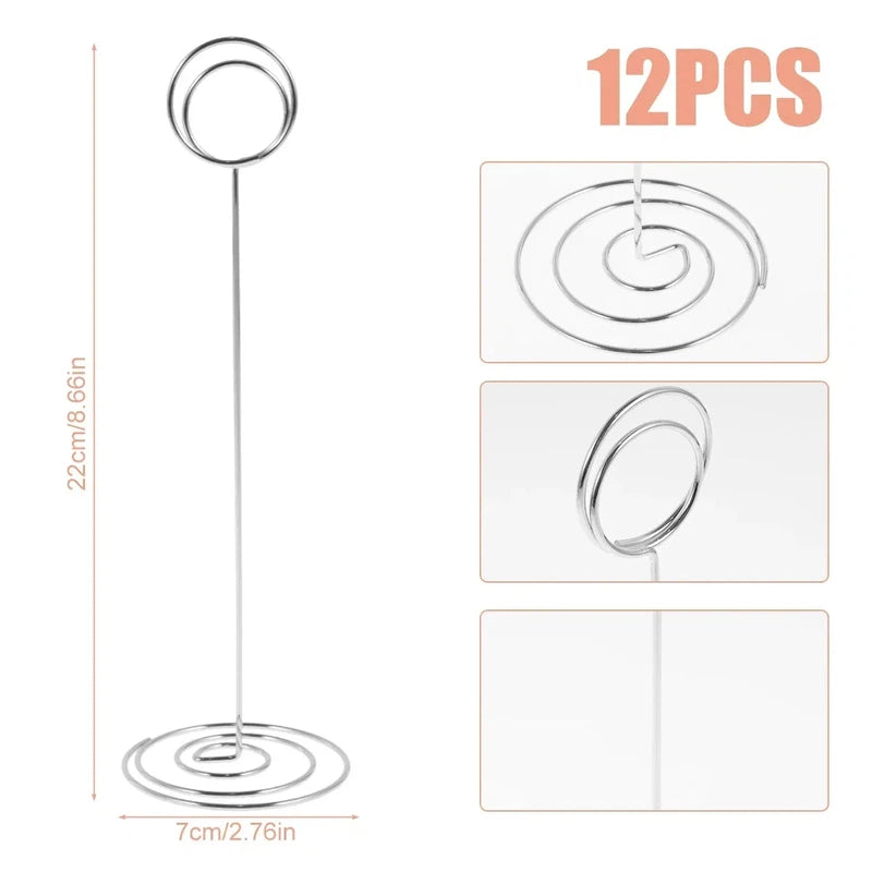[Size and Quantity] The package includes 12 table card holders, and each maximum overall height is 22cm/8.66inch, base diameter 7cm/2.76inch. The smooth and glossy plated surface will not scratch your hands.